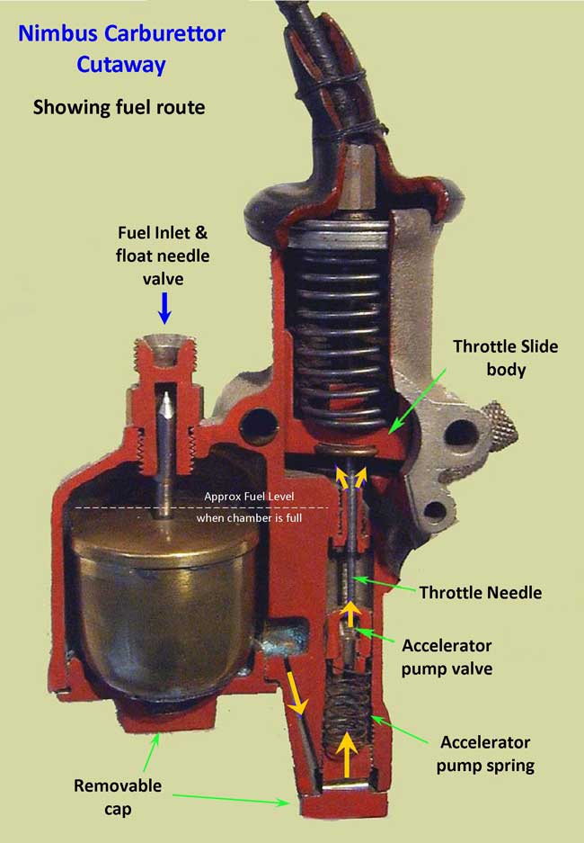 There are several variations of carbs - all Nimbus. For the sake of simplicity there are early ones - pre-1938, and late ones - post 1938. I will attempt to put more data here about these.